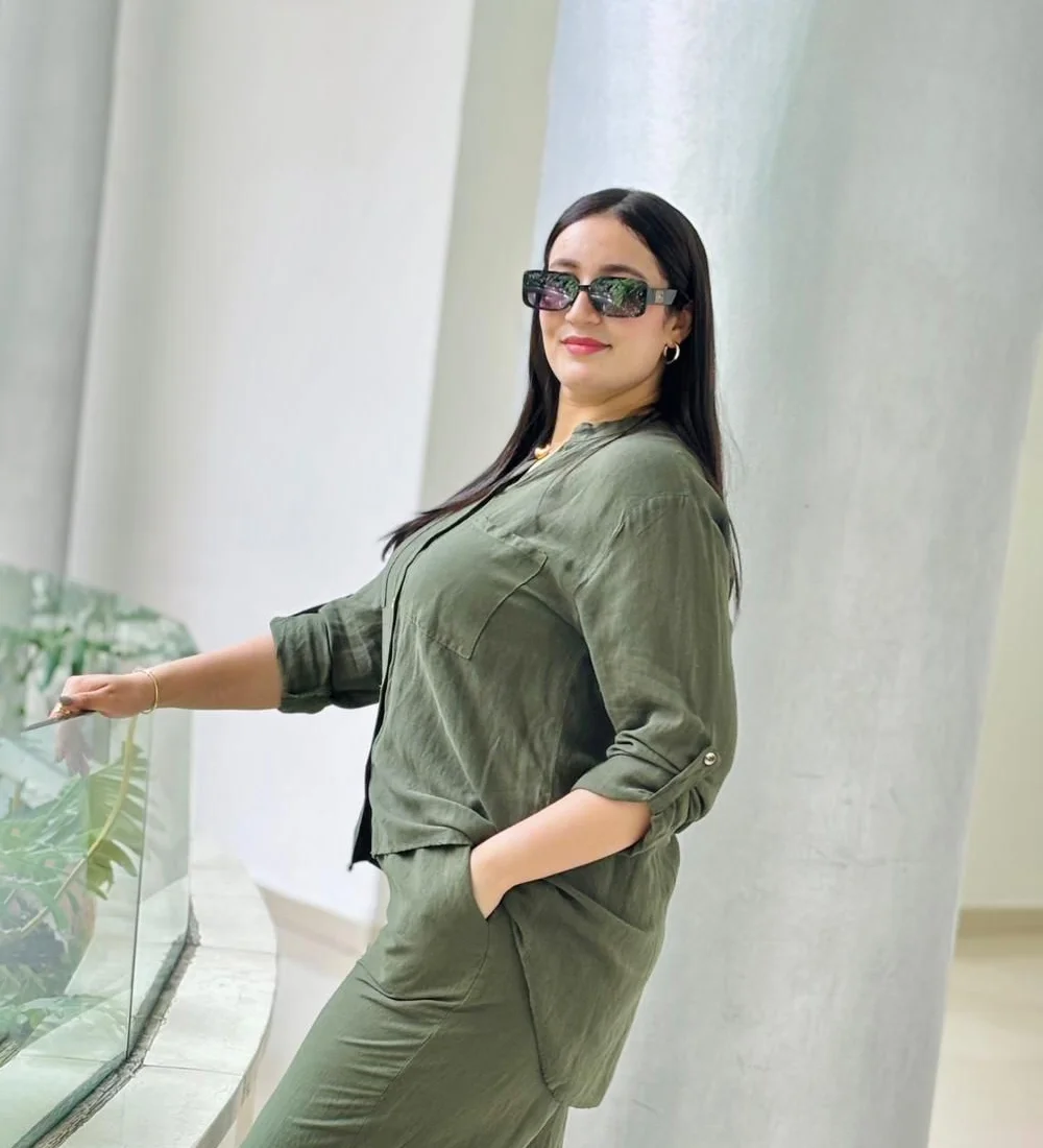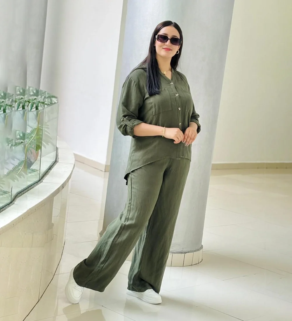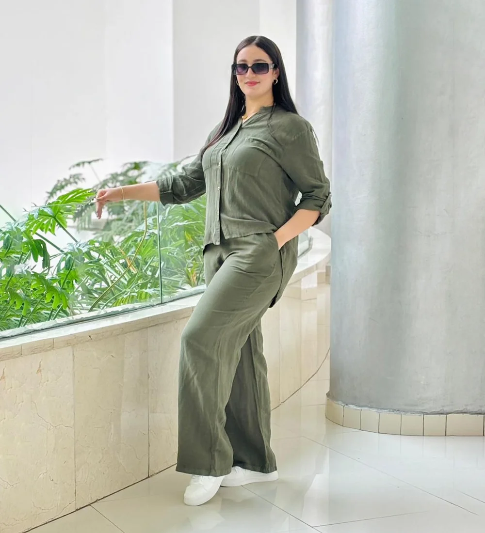 Ce confortable ensemble en lin offre une touche de sophistication avec sa chemise col V, manches longues et sa coupe ample, parfait pour une allure élégante et décontractée.