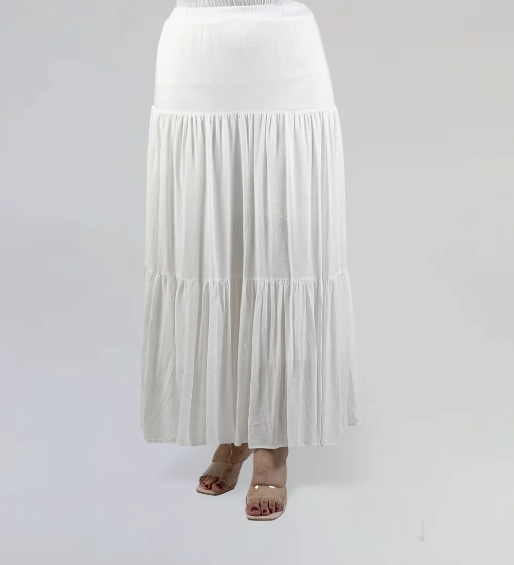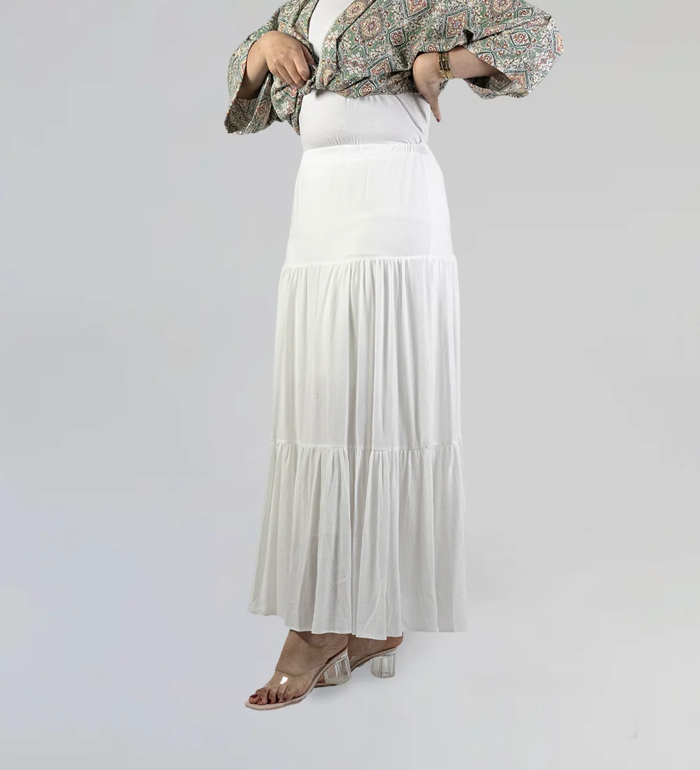 Cette jupe longue blanche est parfaite pour un look estival élégant. Avec ses plis délicats et sa taille haute, elle offre une silhouette fluide et féminine, idéale pour les journées ensoleillées ou les soirées décontractées.