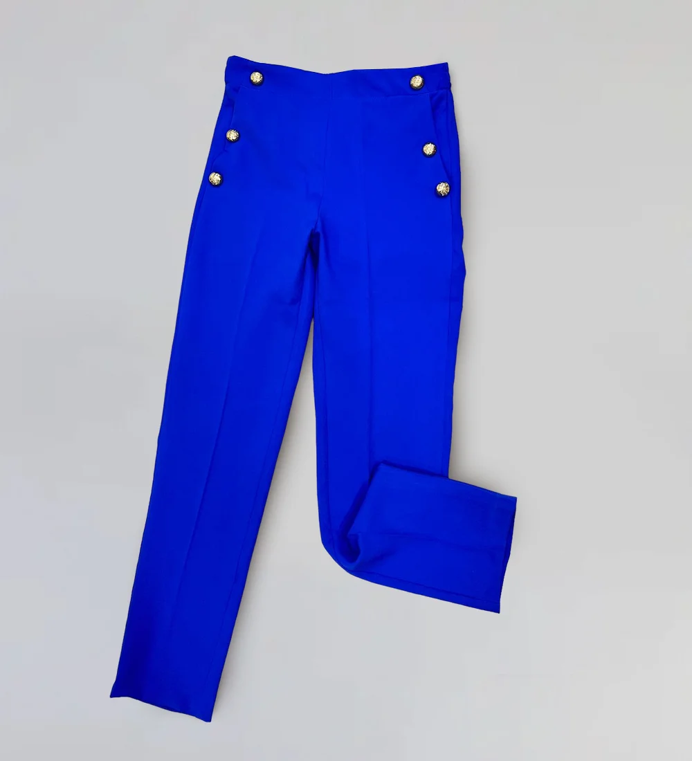 Pantalon à boutons dorés sur les deux cotés. Coupe ajustée et jambe droite.