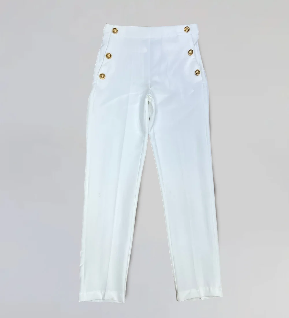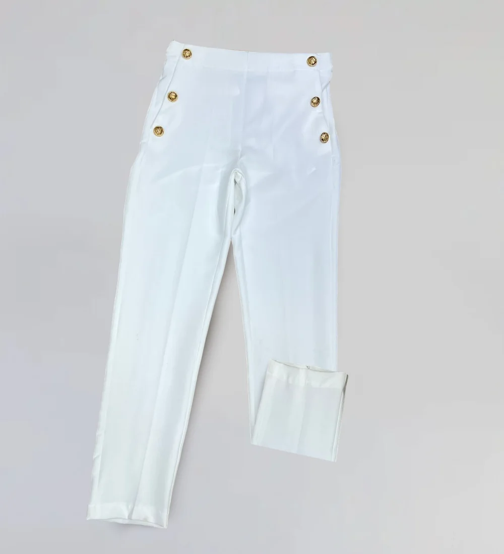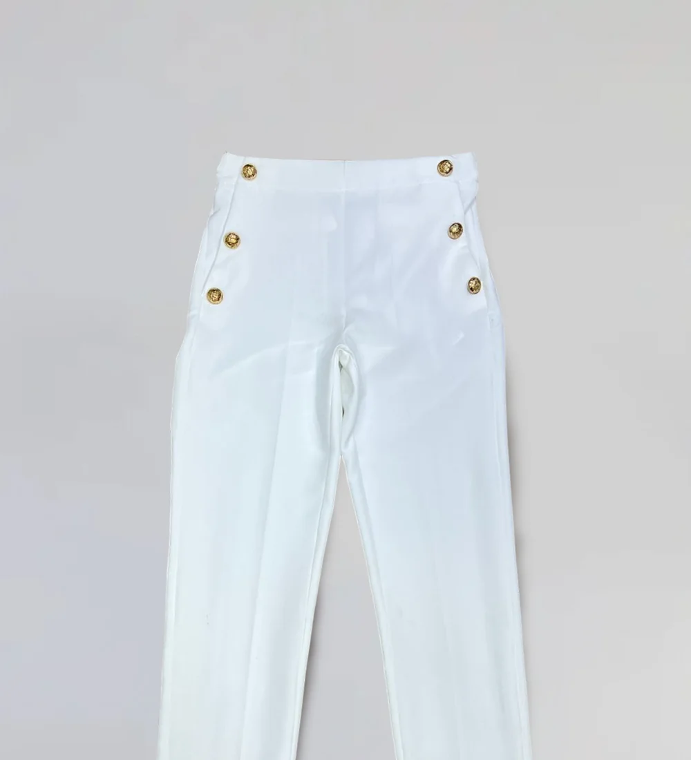 Pantalon à boutons dorés sur les deux cotés. Coupe ajustée et jambe droite.