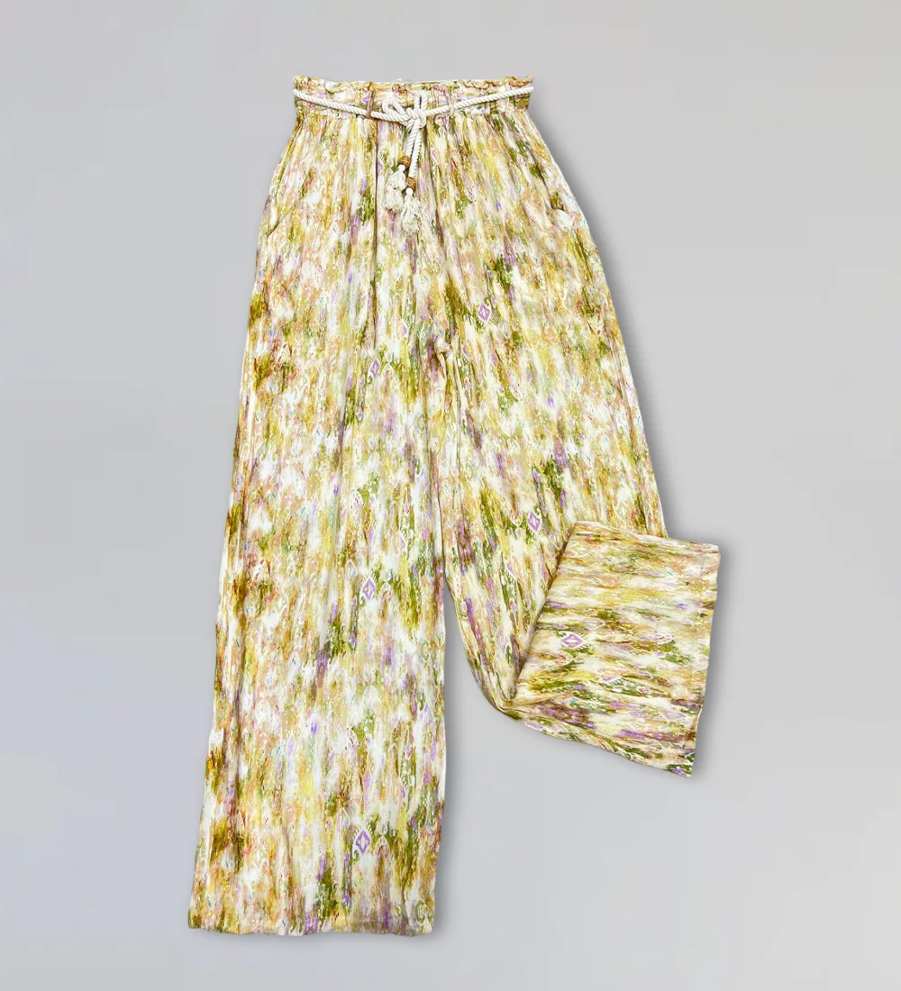 Pantalon fluide à imprimé abstrait. Léger et élégant, il est idéal pour un style chic et décontracté.