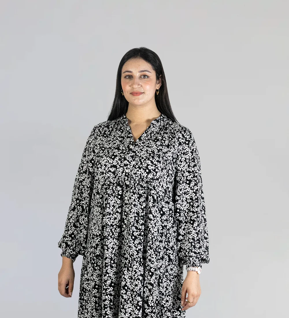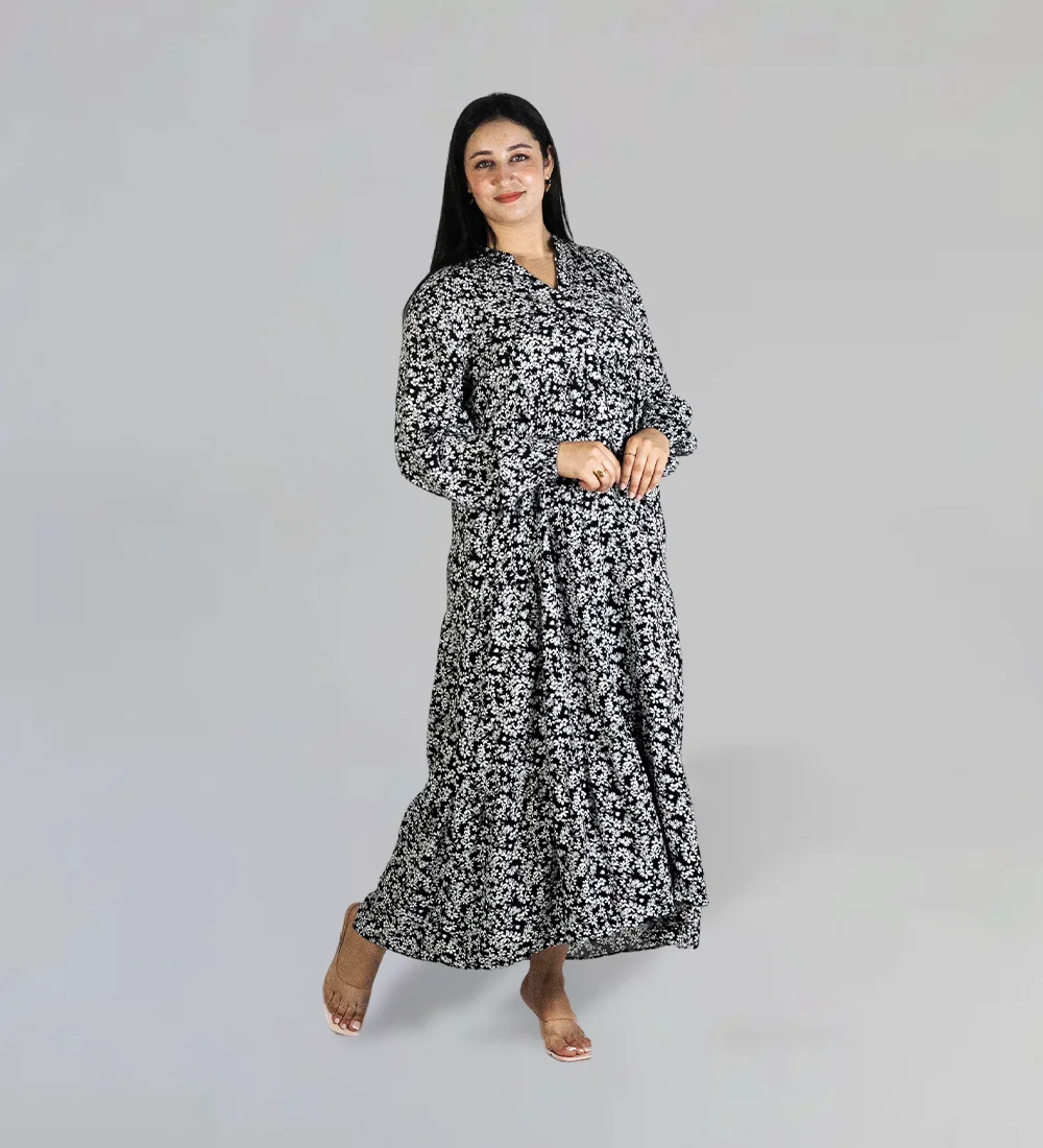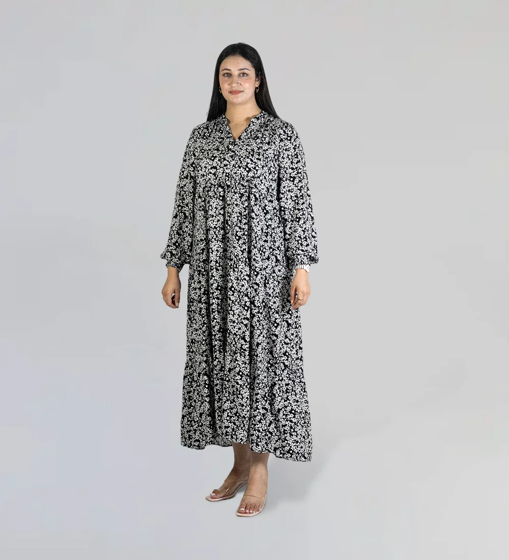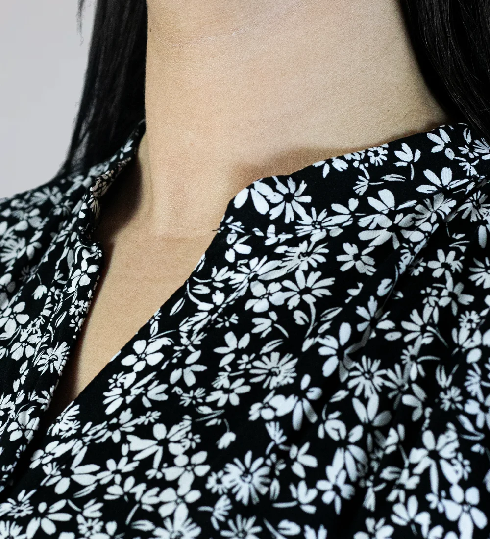 Robe midi imprimée à col rond et décolleté en V.